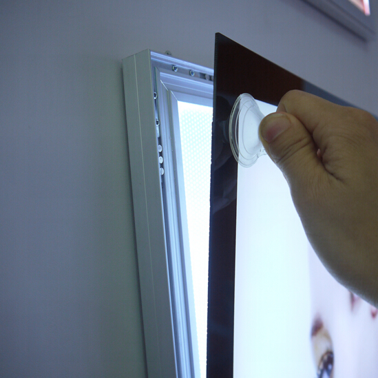 Энергоэффективная LED-подсветка ярко и равномерно светит, тратит минимум электроэнергии и долго работает. Ударопрочное акриловое стекло защищает изображение, выдерживает перепады температур, а по контуру оснащено магнитной лентой для удобной замены контента. Под защитным стеклом может размещаться любой графический материал – рекламный постер, фирменный логотип, информационное сообщение или художественная печать. Из-за магнитной фиксации смена изображения занимает мало времени: достаточно поднять акриловую панель специальной присоской и вставить новый носитель.