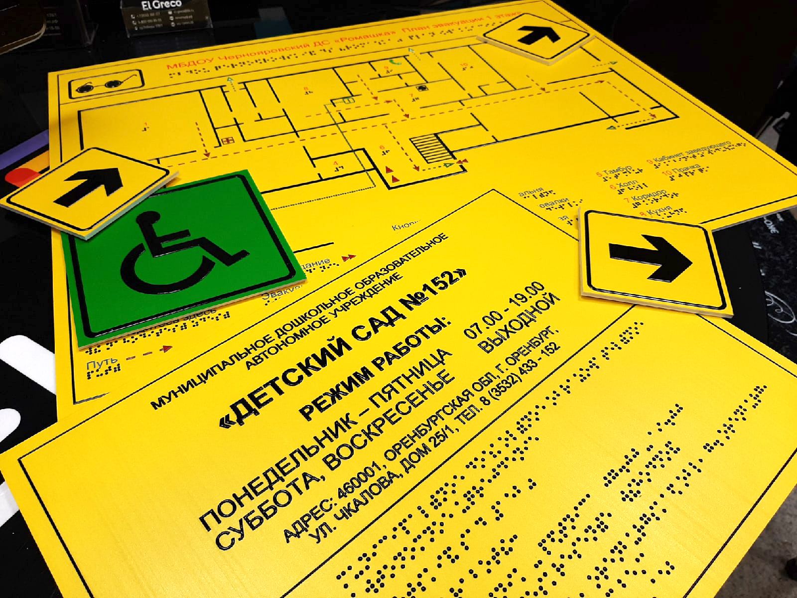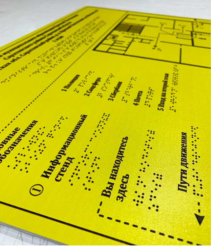 Тактильные таблички — это информационные указатели для людей с нарушениями зрения. Рельефные символы, специальный шрифт и контрастные надписи на этих табличках позволяют воспринимать информацию на ощупь и визуально. Таким образом незрячие и слабовидящие люди могут лучше ориентироваться в пространстве.