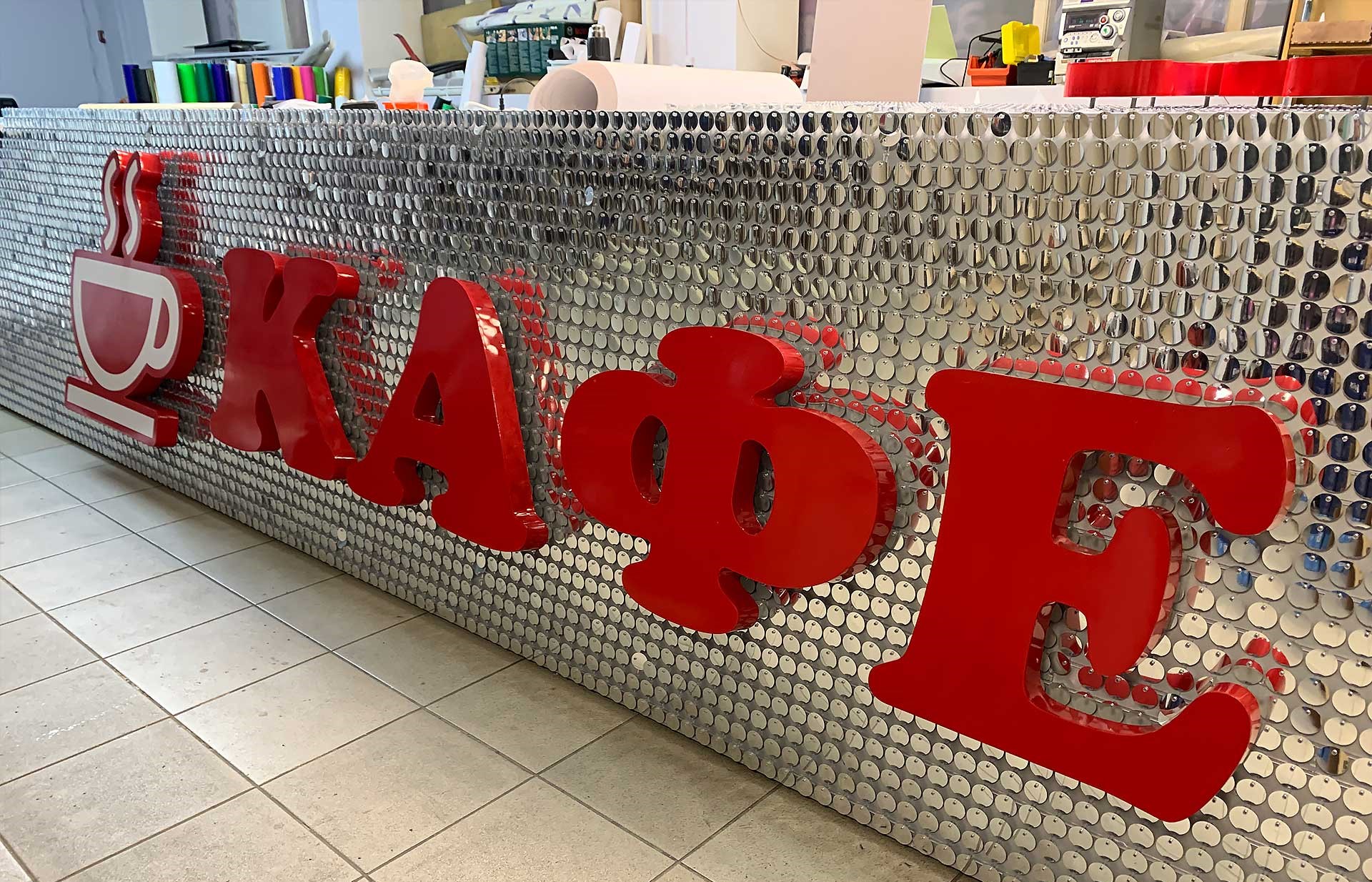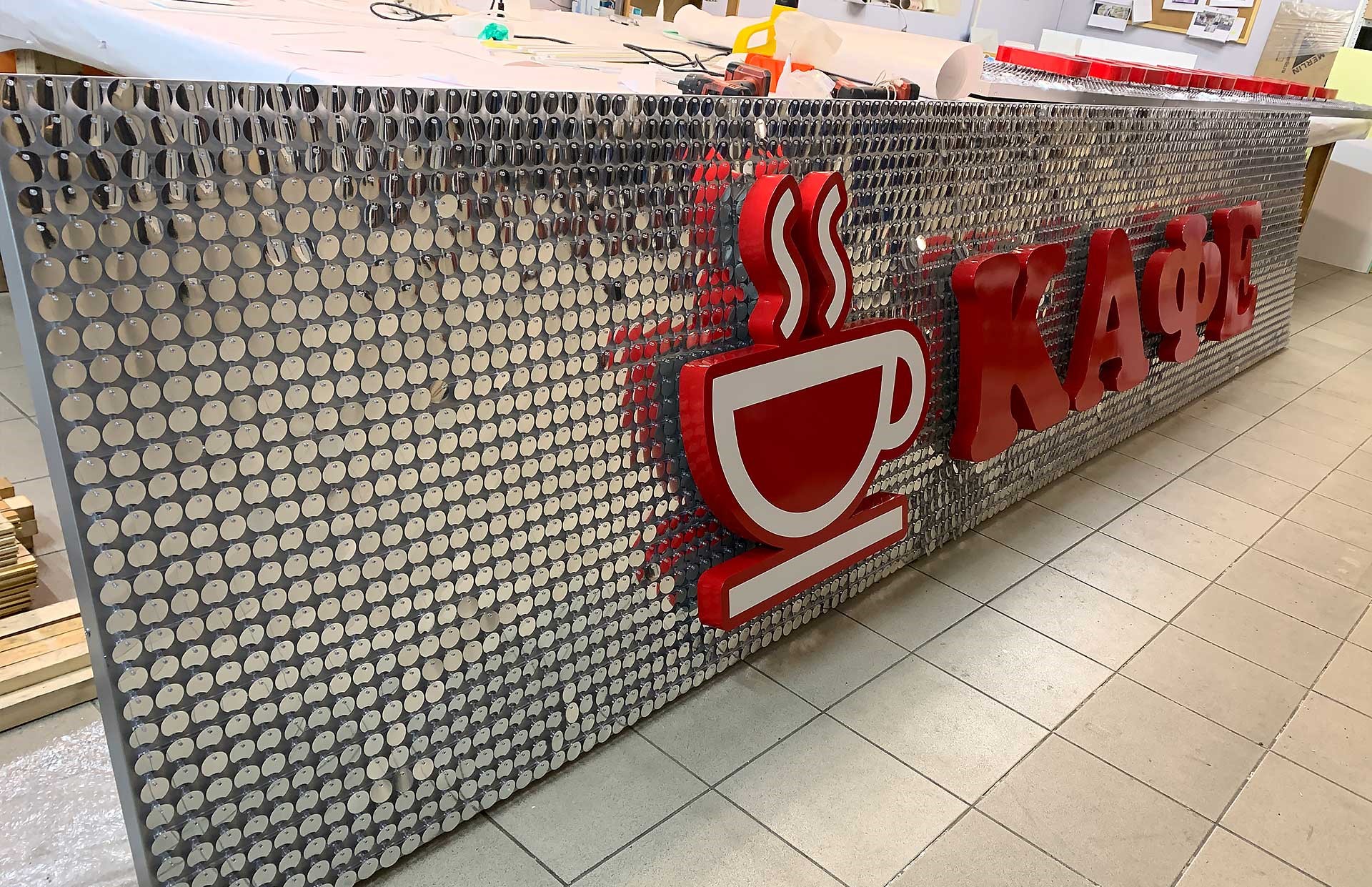 Изготовление вывесок из пайеток у нас происходит с нуля до полной готовности.