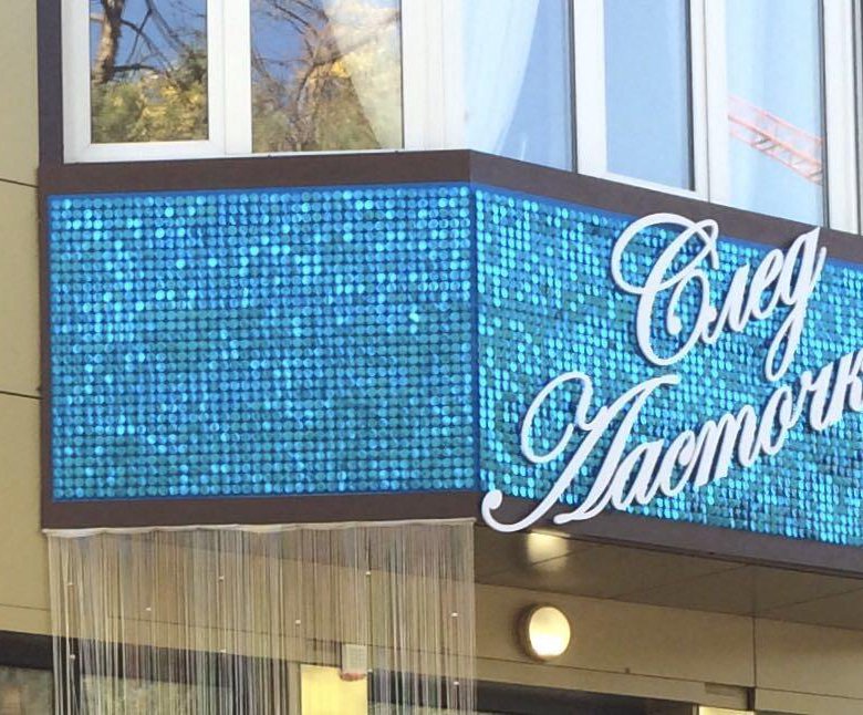 Вывески из пайеток — это необычный формат наружной рекламы, который выделяется за счет динамичного визуального эффекта. Из-за отражающей поверхности пайеток, изображение двигается и переливается, привлекая больше внимания, чем обычные баннеры.